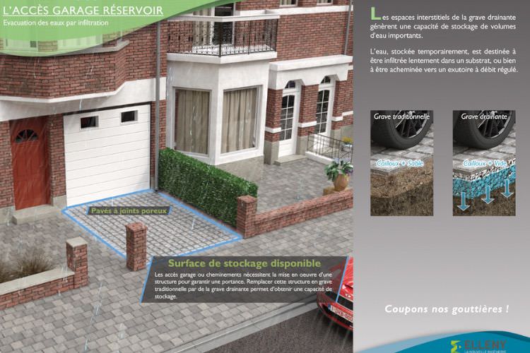 Dans ce contexte, les administrations et les citoyen ont un rôle à jouer ! Une solution efficace est de couper les gouttières du réseau de récupération des eaux. Ainsi l’eau de pluie reste là où elle est tombée sans causer de problème de surcharge et pollution du réseau. Oui ! mais alors, il faut aménager les extérieurs pour qu’ils puissent accueillir et infiltrer les eaux tout en évitant l’inondation de ses environs.